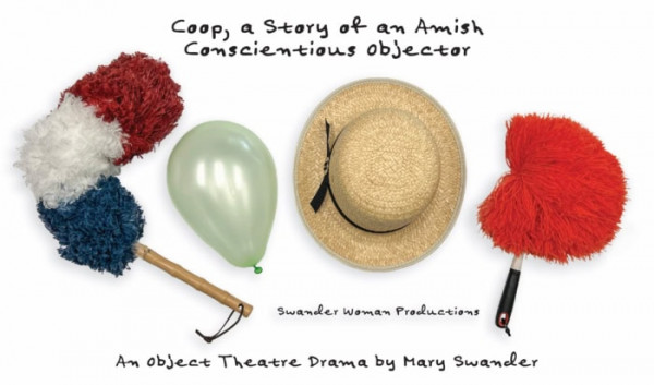 The play, masterfully performed by Rip Russell, is a one-person performance staged on a table with everyday objects representing the characters in the show. Object theatre. Russell pantomimes the action to a narration filled with music, sound effects and excerpts from old news reels. Come and watch traffic cones, dusters, balloons, and clothespins come to life, creating this gripping drama of the challenges German-speaking conscientious objectors endured.